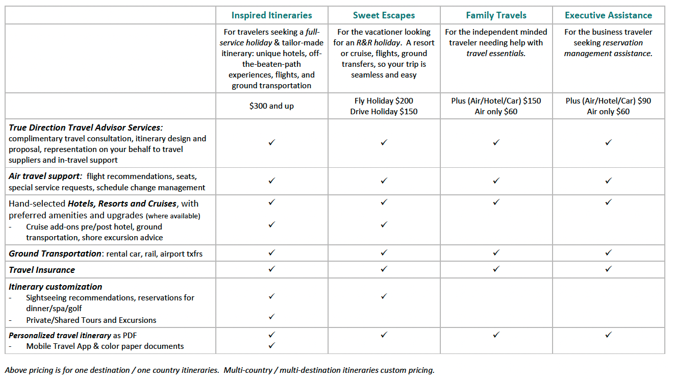 The key to a perfect vacation is in the details. True Direction Travel makes it clear what’s included – and what’s not. Breakfast, WiFi, resort fees, parking fees, bag fees, seat assignments and even special requests – like bedding requests, room location and special dietary needs.